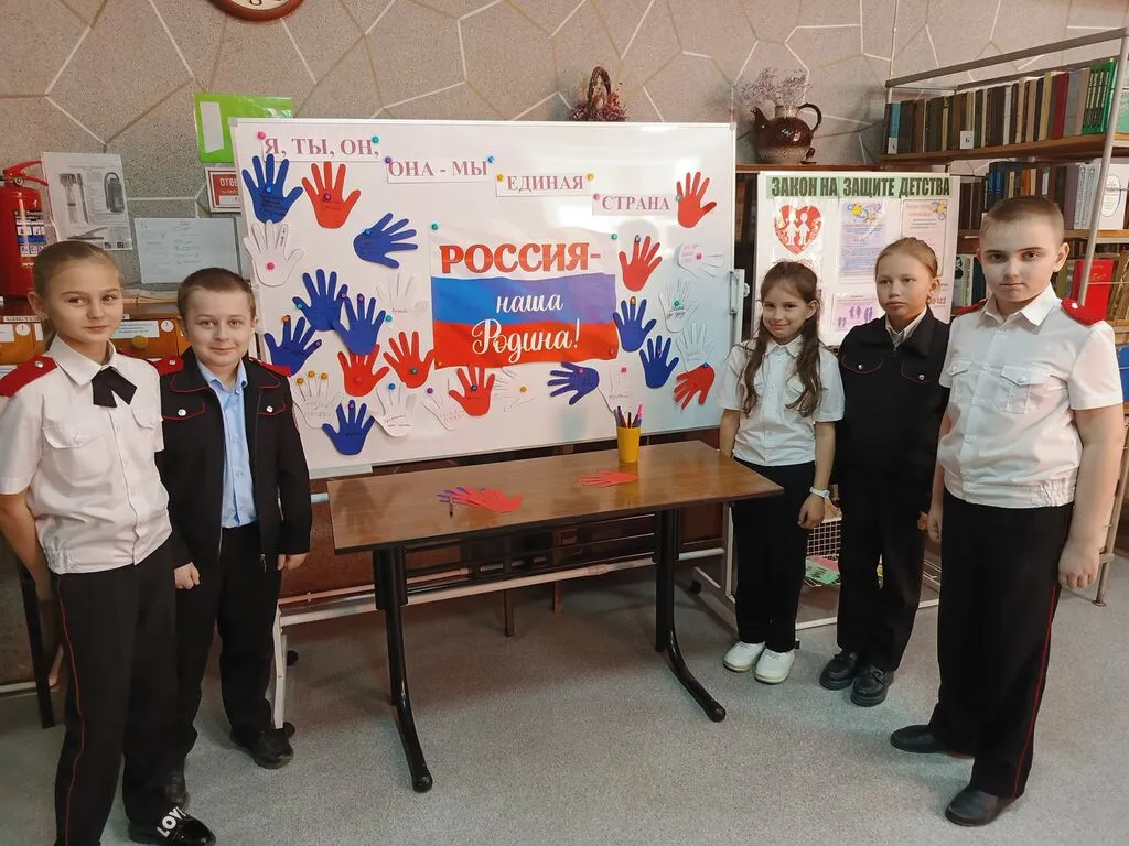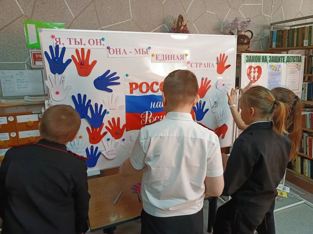 После просмотра видеоролика «Россия – это мы!» ребятам предложили на разноцветных ладошках, вырезанных из бумаги, написать ответ на вопрос «Что такое единство?» и прикрепить их на доску, символизирующую многонациональность России.
